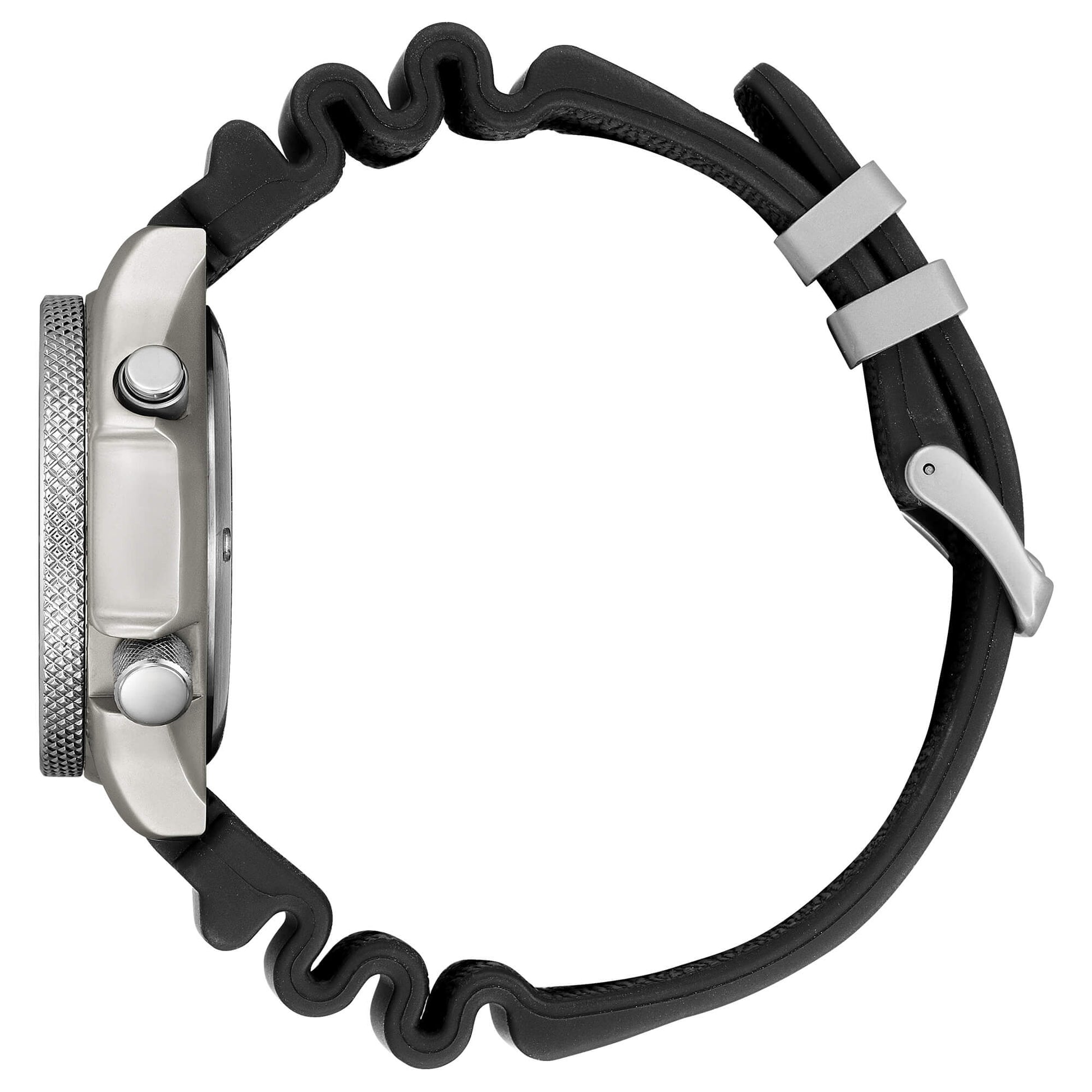 Cassa in acciaio, cinturino in morbido poliuretano. Indici e sfere ad alta visibilità. Fondo e corona serrati a vite. Ghiera girevole unidirezionale zigrinata. Vetro minerale. WR 20 bar.
