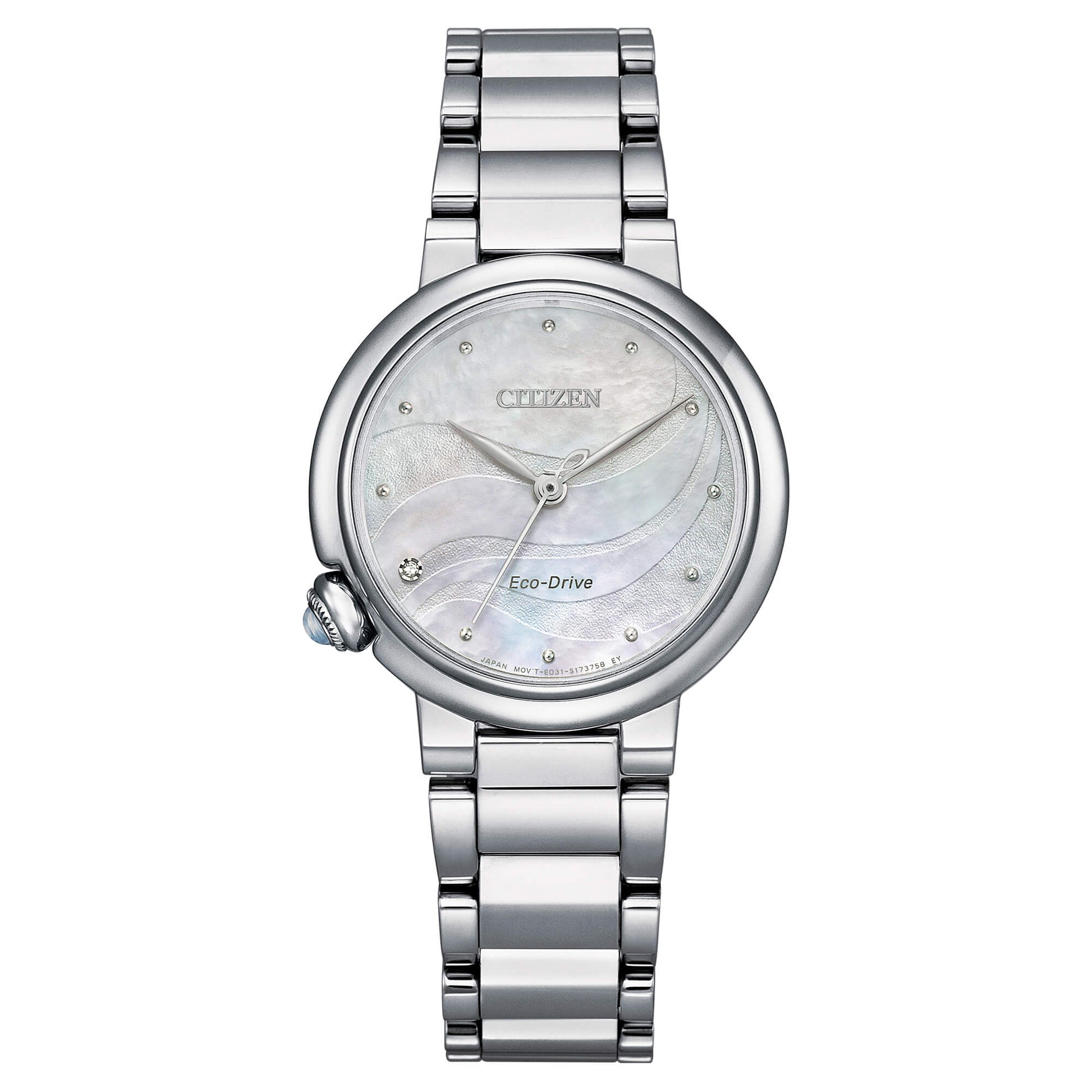 Cassa e bracciale in acciaio, vetro zaffiro curvo. Quadrante in madreperla con diamante a ore 8. Corona cabochon. WR 5 bar.