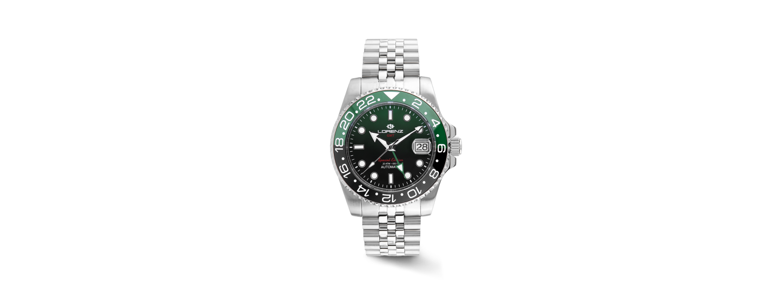 Questo orologio rappresenta l’ultima evoluzione dei modelli GMT di Lorenz. La cassa, realizzata in acciaio 316L con finitura lucida e satinata, ha un diametro di 40 mm. Il fondello trasparente a vite consente di ammirare il movimento Seiko NH34, caratterizzato da una massa oscillante personalizzata nel colore. La lunetta unidirezionale a 120 scatti è realizzata in ceramica solida, mentre il bracciale jubilée con finitura lucida e satinata si abbina perfettamente al quadrante particolare, con un effetto degradé in due tonalità, conferendo al segnatempo un aspetto sportivo e distintivo. Con un’impermeabilità fino a 200 metri, questo orologio è il compagno ideale per le vostre avventure, che si tratti di un viaggio o della vita quotidiana.
