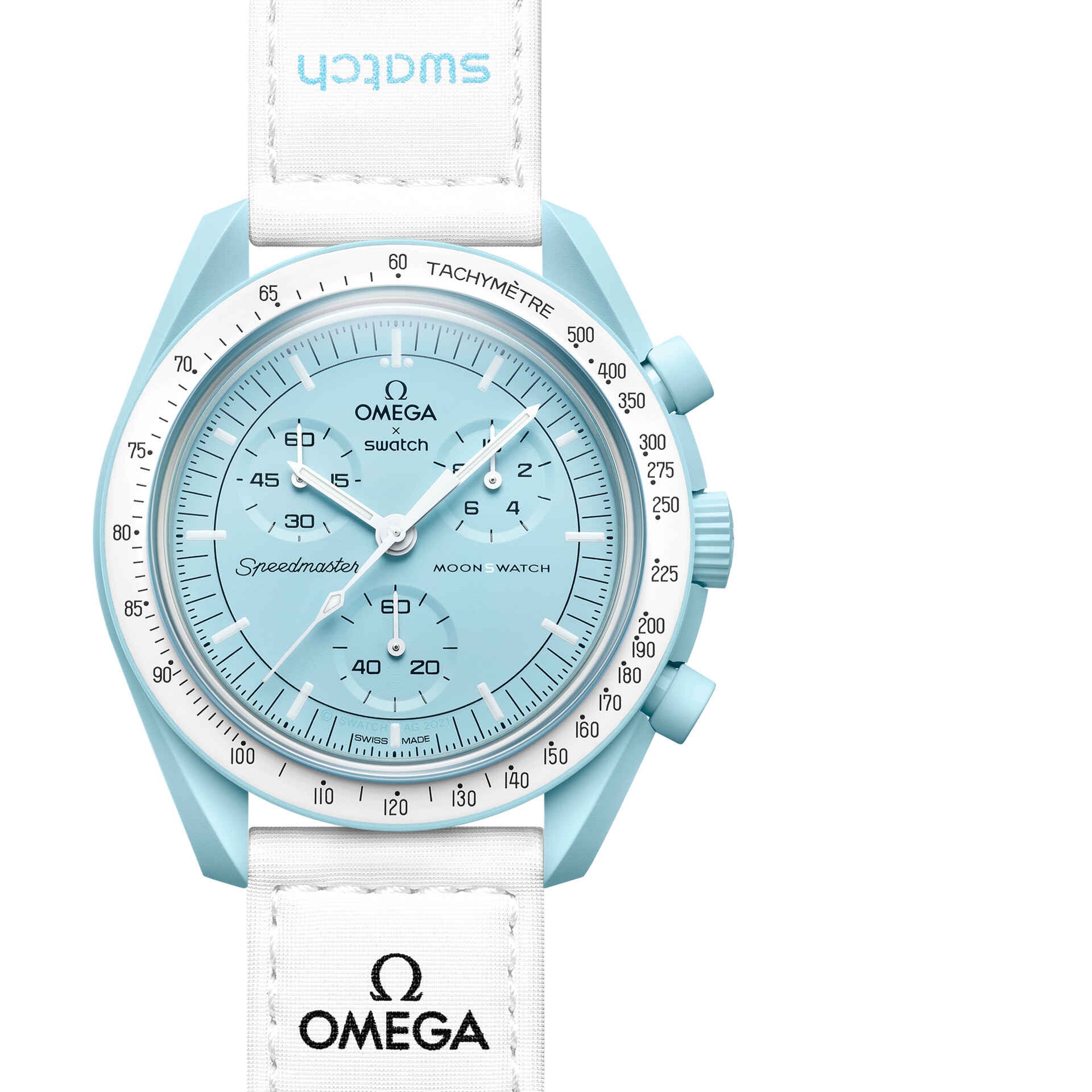 L'etereo blu pastello incontra un cinturino in VELCRO© di colore bianco acceso su questo esemplare della collezione Mission. La lancetta del cronografo, le lancette dei contatori e lo sfondo della scala tachimetrica sono di colore bianco. Tutti i quadranti sono contraddistinti dal marchio OMEGA X SWATCH, nonché dall'iconico logo Speedmaster e dal nuovo logo MoonSwatch. La struttura del vetro, la "S nascosta" integrata al centro, il motivo circolare raffinato ed elegante sull'anello esterno del quadrante e i quadranti secondari, la struttura sottile e armoniosa degli aggetti, l'iconico dettaglio del "punto sopra al 90" sulla lunetta con scala tachimetrica e, naturalmente, il tocco unico di Bioceramic sono caratteristiche comuni di tutti i modelli e dimostrano lo straordinario amore per i dettagli. Tutte le lancette di ore, minuti e secondi del cronografo e gli indicatori dell'ora presentano il trattamento Superluminova, per una perfetta fosforescenza al buio. SO33L100