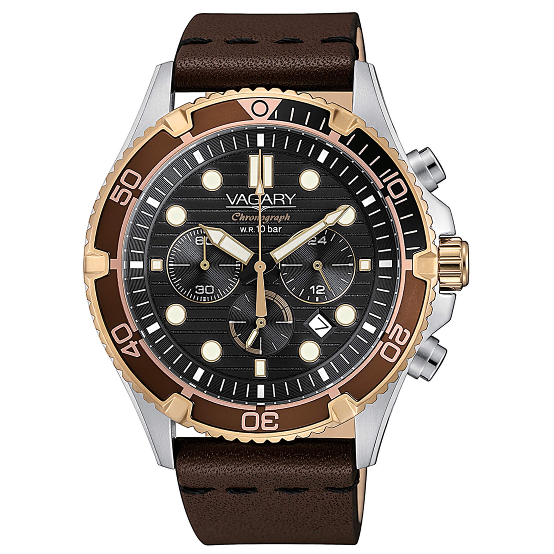 Cassa in acciaio con fondello e corona serrati a vite. Ghiera girevole unidirezionale.Cinturino in pelle. WR 10 bar.