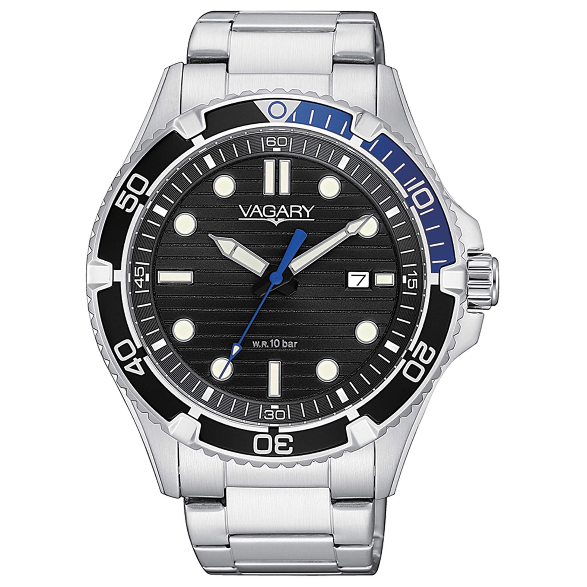 Cassa in acciaio con fondello e corona serrati a vite. Ghiera girevole unidirezionale. Bracciale in acciaio con chiusura di sicurezza. WR 10 bar.