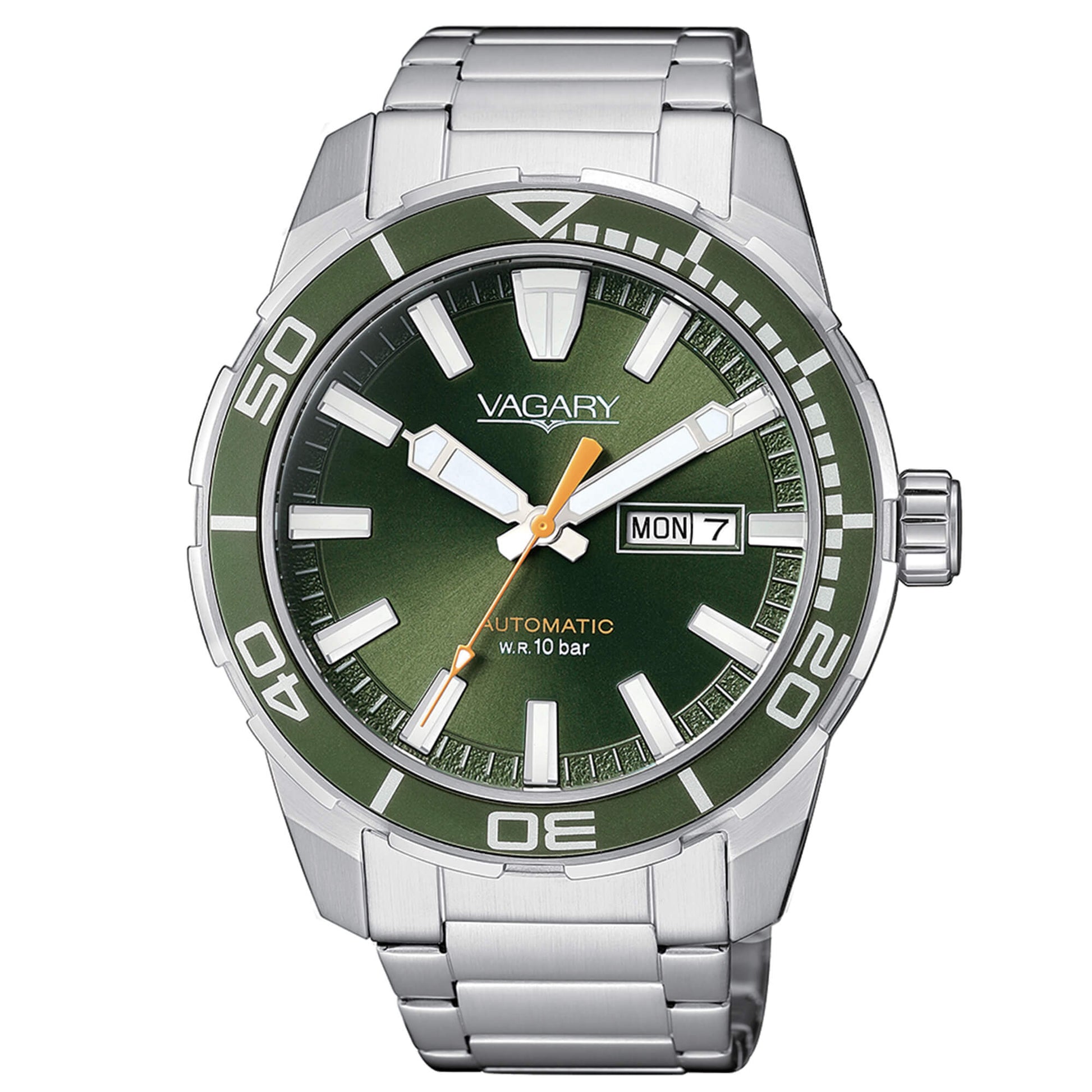Cassa e bracciale in acciaio con fondo a vite e oblo trasparente. Movimento a vista. Ghiera girevole in alluminio. Vetro minerale. WR 10 bar.